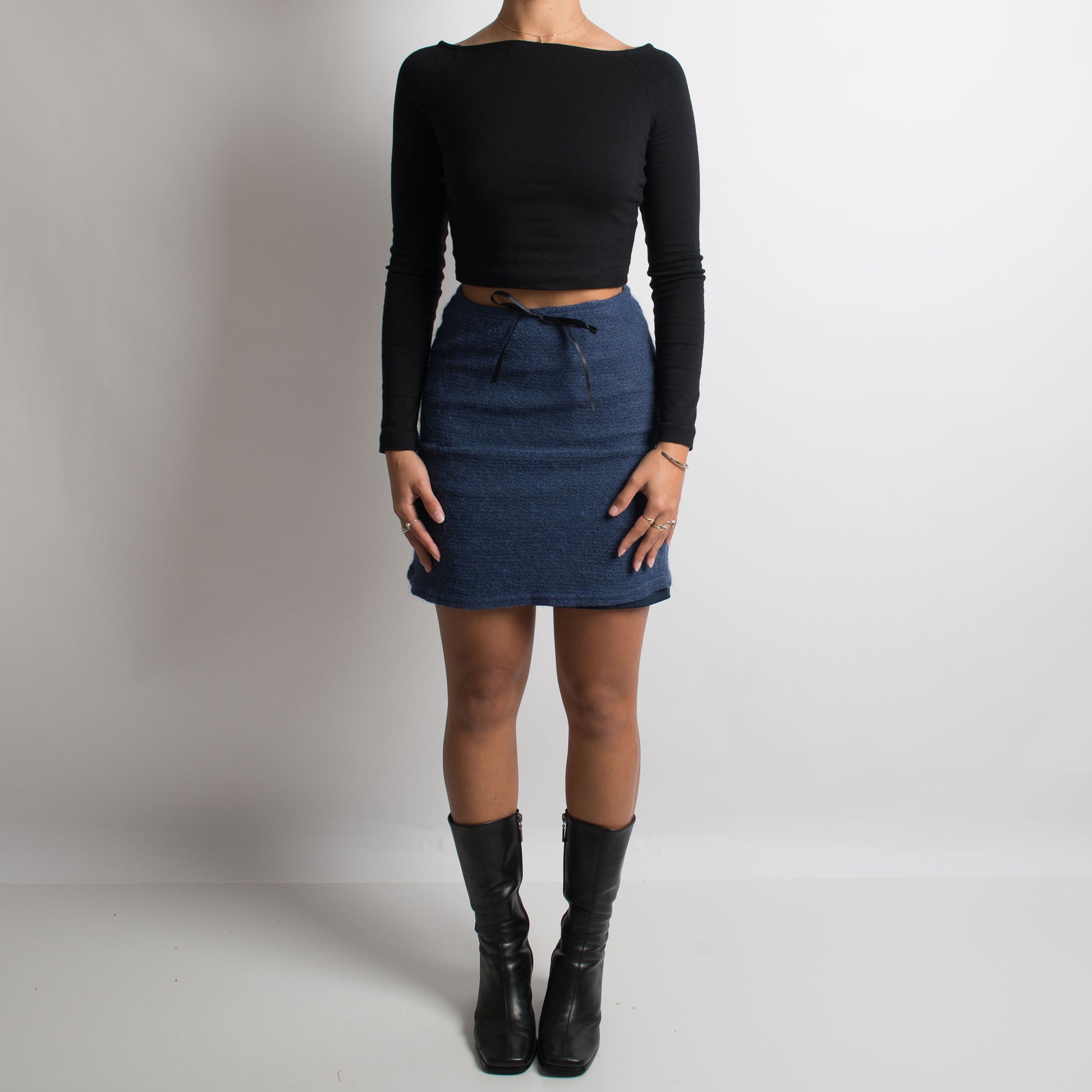 this knit skirt will be your new favourite transeasonal piece. featuring a thin knit overlay with inner lining, and an adorable decorative bow at the elasticated waistband.